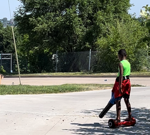 As I was driving away, I snapped a pic of Ian riding his hoverboard while blowing off the grass clippings…GENIUS. He was able to harness the power of the hoverboard and blower to complete his part of the lawn work.